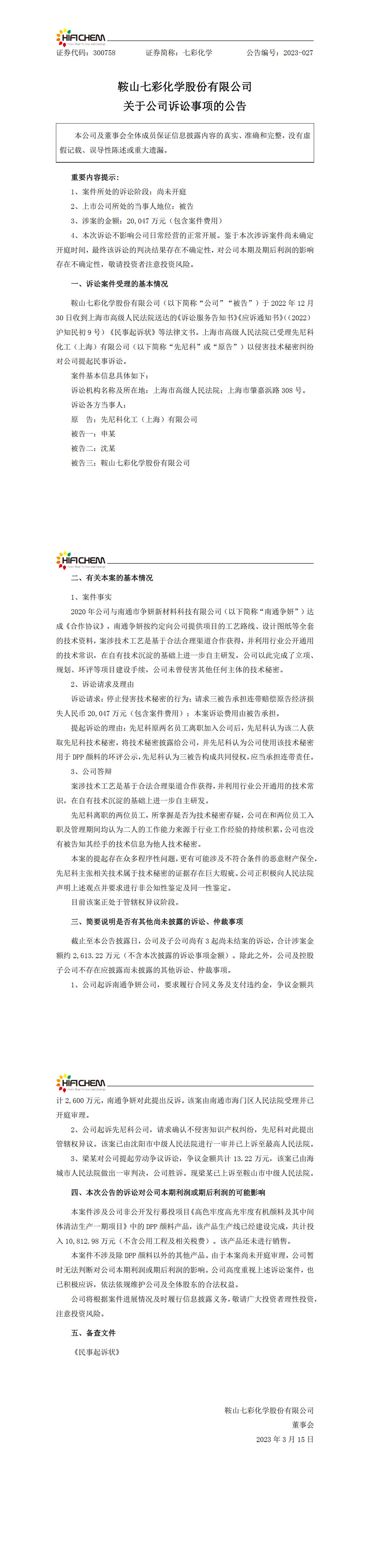 鑒于鞍山七彩化學(xué)股份有限公司(以下簡稱“七彩化學(xué)”)于2023年3月15日發(fā)布公告(隨附《鞍山七彩化學(xué)股份有限公司關(guān)于公司訴訟事項(xiàng)的公告》),提及與我司(先尼科化工(上海)有限公司)相關(guān)糾紛。